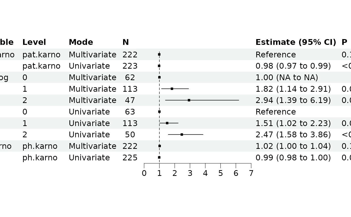 Creates a forest plot comparing univariate and multivariate model results side by side. Each variable shows estimates from both modeling approaches.
